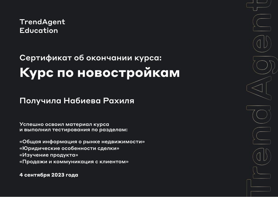 Дипломированный специалист, эксперт рынка недвижимости. Все услуги в сфере новостроек, вторичной, загородной недвижимости. Продажа, покупка, аренда, юридическое сопровождение, помощь в одобрении ипотеки.