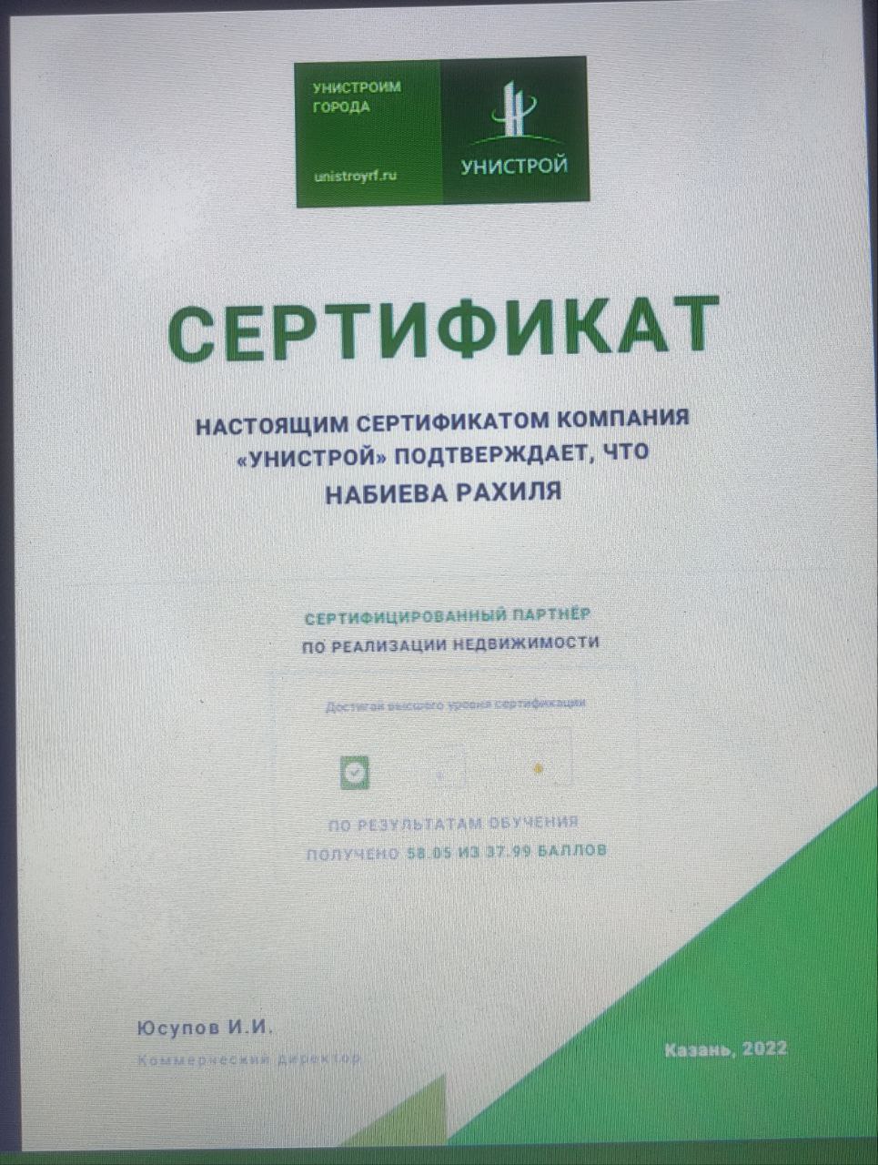 Уважаемая Рахиля! Благодарю вас за проделанную работу в организации продажи квартиры. Огромное спасибо за оформление всех документов и грамотное проведение сделки! Все коммуникации осуществлялись быстро и на высоком профессиональном уровне. Было много волнений и переживаний, но все, что зависело от Рахили, делалось оперативно и в установленные сроки. Рахиля Гузаировна- очень ответственный, отзывчивый, грамотный специалист, знающий и любящий свое дело.
